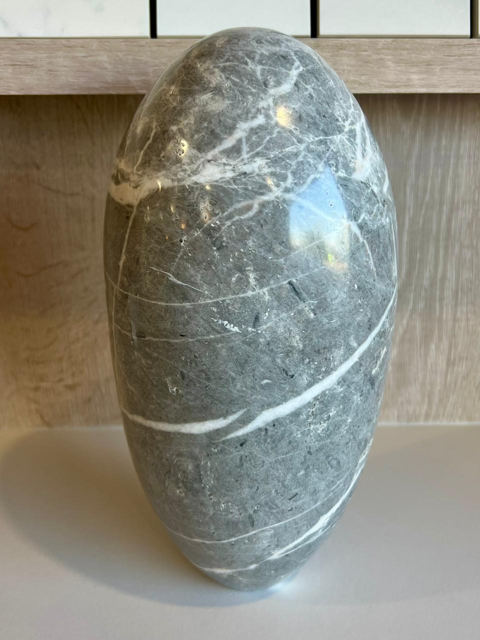 Pieza tallada en piedra natural con silueta de huevo, ideal como acento minimalista y elegante para cualquier espacio. Disponible en Travertino Beige o Gris Santo Tomás. Su forma orgánica y acabado pulido aportan equilibrio, textura y sofisticación a la decoración interior.